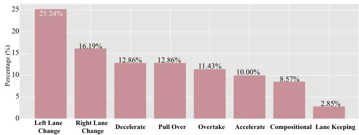 光有方法不行,还得有把好尺子来衡量。论文的另一大贡献是提出了POINT基准。POINT是“Passenger Open-ended INstruction TesTbed”的缩写,即乘客开放式指令测试平台。它基于一个高保真的自动驾驶模拟器——nuPlan(使用了1300小时真实驾驶数据重建),并为其增加了1050对“指令-场景”数据。这些指令由真实指令和LLM生成指令混合而成,并经过人工筛选,确保质量和多样性。图4:指令意图分布。可以看到,约70%的指令涉及高风险横向操纵(如变道、超车、靠边停车),便于在高风险城市场景中进行集中评估。POINT还建立了一套全面的闭环评估指标,涵盖三大方面: