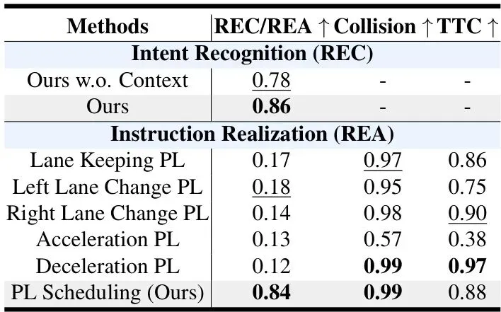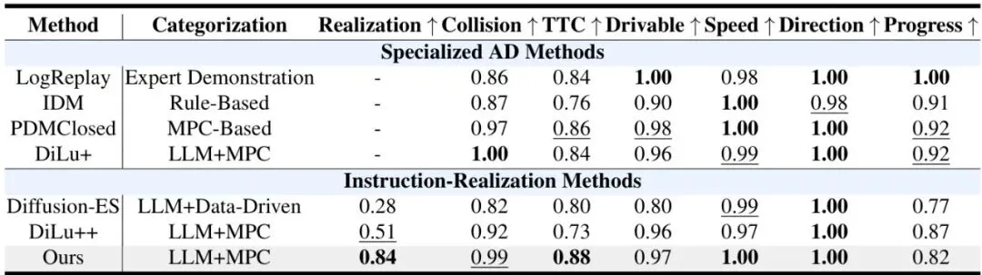 3. 合规相关:在可行驶区域内的时间占比、遵守限速的时间占比、行驶方向正确的时间占比。有了统一的尺子和考题,就可以公平地比较不同方法了。论文还贴心地提供了多种基线方法,包括专业AD方法(如纯MPC规划器)和其他类型的LLM指令实现方法,为后续研究铺平了道路。实验结果:指令完成率飙升,安全不打折