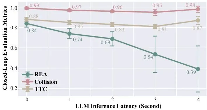 首先,理解开放式指令确实不容易。如图5所示,只有参数量非常大的模型(如Qwen-2.5-72B, DeepSeekV3)意图识别准确率才能超过85%。这说明,想让车真正“听懂人话”,大模型的能力是基础。图5:不同LLM的意图识别得分。只有大规模模型(如Qwen-2.5-72B, DeepSeekV3, DeepSeek-R1)的识别率超过85%,推理机制和更大的上下文窗口能进一步提升性能。重头戏在指令实现的性能对比(表1)。所有基于LLM的方法都使用相同的DeepSeekV3 backbone,确保公平。表1:指令实现性能的定量比较。所有基于LLM的方法使用共享的骨干网络,指标为多次随机种子的平均值。每个指标在[0,1]范围内。核心结论1:任务完成率大幅领先在“指令实现”这项核心指标上,本方法达到了0.84,而其他两个指令实现基线方法DiLu++和Diffusion-ES分别只有0.51和0.28。这意味着本方法的成功率比它们高出64%到200%!这充分证明了“调度脚本”模式在连贯、可靠地执行复杂指令序列方面的优势。核心结论2:安全性与专业AD方法看齐更牛的是,在追求高任务完成率的同时,本方法在安全性(无碰撞率0.99)和合规性指标上,与顶尖的专业自动驾驶方法(如PDM)不相上下,甚至某些方面更优。这完美验证了其“解耦”设计的安全有效性:执行乘客指令,但绝不以牺牲安全为代价。再来看看消融实验(表2)和延迟分析(图7),进一步揭示了框架成功的原因。表2:关于交通上下文和LLM引导规划器调度的消融研究。消融实验证明:1. 提供交通上下文给LLM,能让意图识别准确率提升约10%。2. 如果没有LLM的高层调度,只是孤立地调用各个原子规划器,任务完成率会惨不忍睹(表中各行单独规划器的REA都很低)。这凸显了全局协调调度的必要性。图7:延迟敏感性分析。随着LLM决策延迟增加,指令实现分数逐渐下降,但安全指标保持稳定。延迟分析证明:本方法对LLM的推理延迟有很强的容忍度。即使引入延迟,任务完成率会下降,但安全性指标依然坚挺。这再次归功于架构:LLM只在开始时被调用一次生成脚本,后续的高频安全控制由独立的内循环保障,不依赖LLM的实时响应。最后,通过图6的定性示例,我们可以直观感受框架的执行过程。图6:指令执行过程中的关键帧。(a) 系统推断出隐含的变道意图,减速并汇入更慢、更密集的车道。(b) 响应靠边停车请求,通过变道并安全停车。未来之路:视觉融合与更智能的触发
