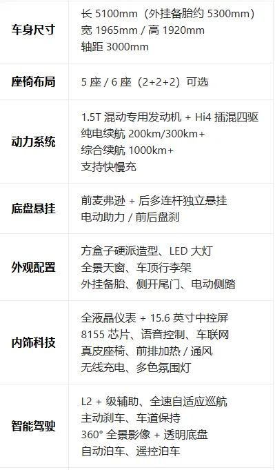 车身数据上,它的常规版本超五米一,外挂备胎后逼近五米三,三米轴距带来的宽敞感,是家庭用户最看重的点,5座或6座的布局选项,搭配插混系统与超长纯电续航,完全跳出小尺寸方盒的“玩具属性”