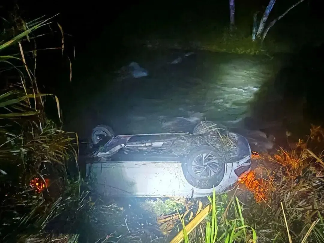 小轿车四轮朝天倒扣在小溪边