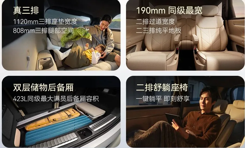 87.4%的得房率意味着这台车把外部尺寸尽可能转化成了内部可用空间。77%的横向利用率则确保了三名成年人并排而坐时不至于肩膀碰肩膀。但更直观的体验来自第三排——坐垫长度、厚度和靠背角度都经过专门优化,一名身高1.75米的成年人落座后,腿部仍有富余,头部不会感到压抑。