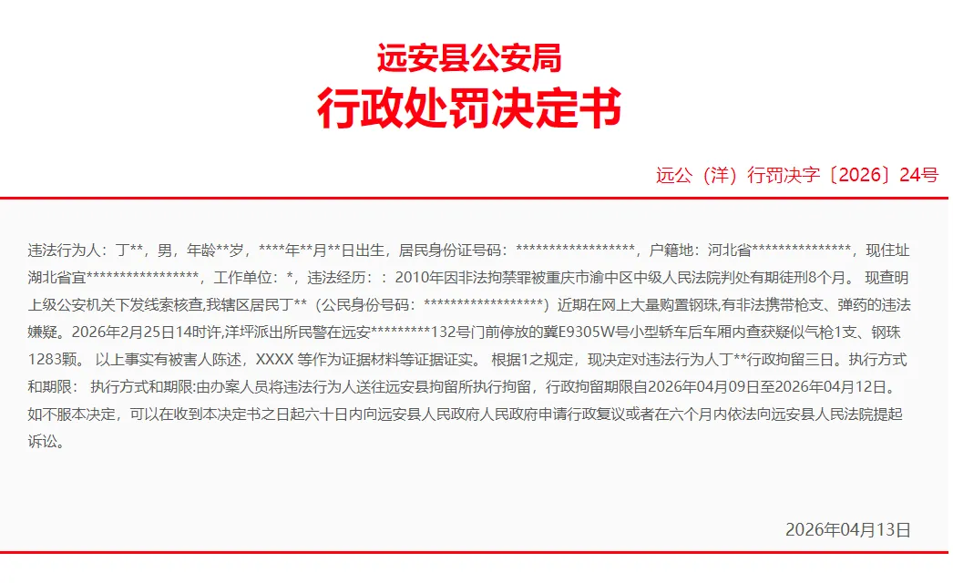 根据远安县公安局今天(2026年04月13日)刚发布在湖北公安执法公开平台上的这则行政处罚决定书显示,远安县公安局洋坪派出所根据上级线索,成功破获一起非法携带枪支弹药案,违法行为人丁某某被依法作出行政拘留处罚。