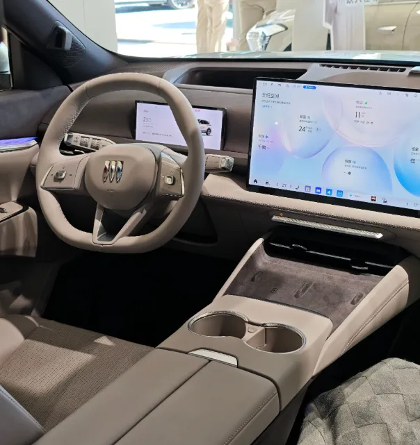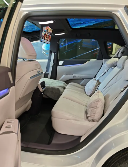 内饰设计,我们也进行了体验,整体来说能摸得到的绝大多数地方都是软包的,不仅拥有两个悬浮式的大屏设计,更是搭载了HUD数字抬头显示,座椅加热、通风、按摩等一系列的配置也是一应俱全的。这款别克至境E7可以称得上是真正的头等舱,为什么这么说?因为座椅是带有按摩功能的,高配车型上也匹配了头枕音响。更关键的是第2排舒适度真的很高,整个座椅靠背向后仰得非常明显,能用躺坐的姿态来乘坐,前排的座椅也可以与第2排的座椅一体化连接,单独的天窗,单独的吸顶电视,这还不够舒适吗?