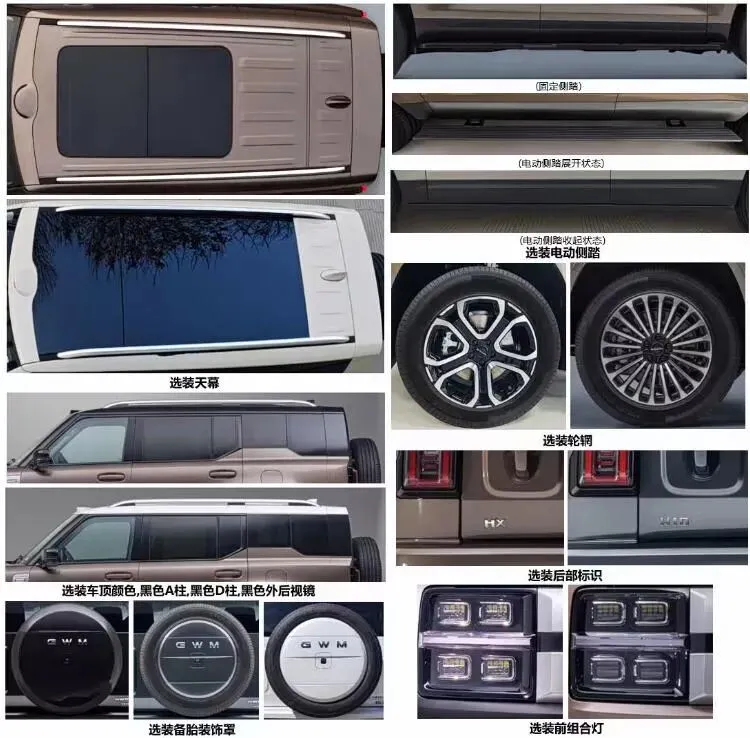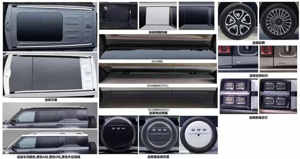 选装配置十分丰富,提供天幕、双色车顶、黑色 A柱/D柱、黑色外后视镜、备胎装饰罩、电动侧踏、多款轮圈、前后灯组及尾部标识等个性化方案。