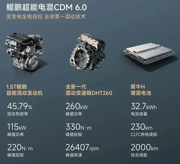 动力系统上,风云T9L搭载鲲鹏超能电混CDM 6.0系统,配备1.5T鲲鹏超能混动发动机与全新一代混动变速箱DHT260,其中DHT260变速箱最高机械效率达98.5%,这也是该车行驶平顺性的核心保障。实测显示,该车纯电模式下起步轻盈、静谧性出色,适合城市通勤;智能油电模式下,动力切换流畅无顿挫,可兼顾动力与经济性。