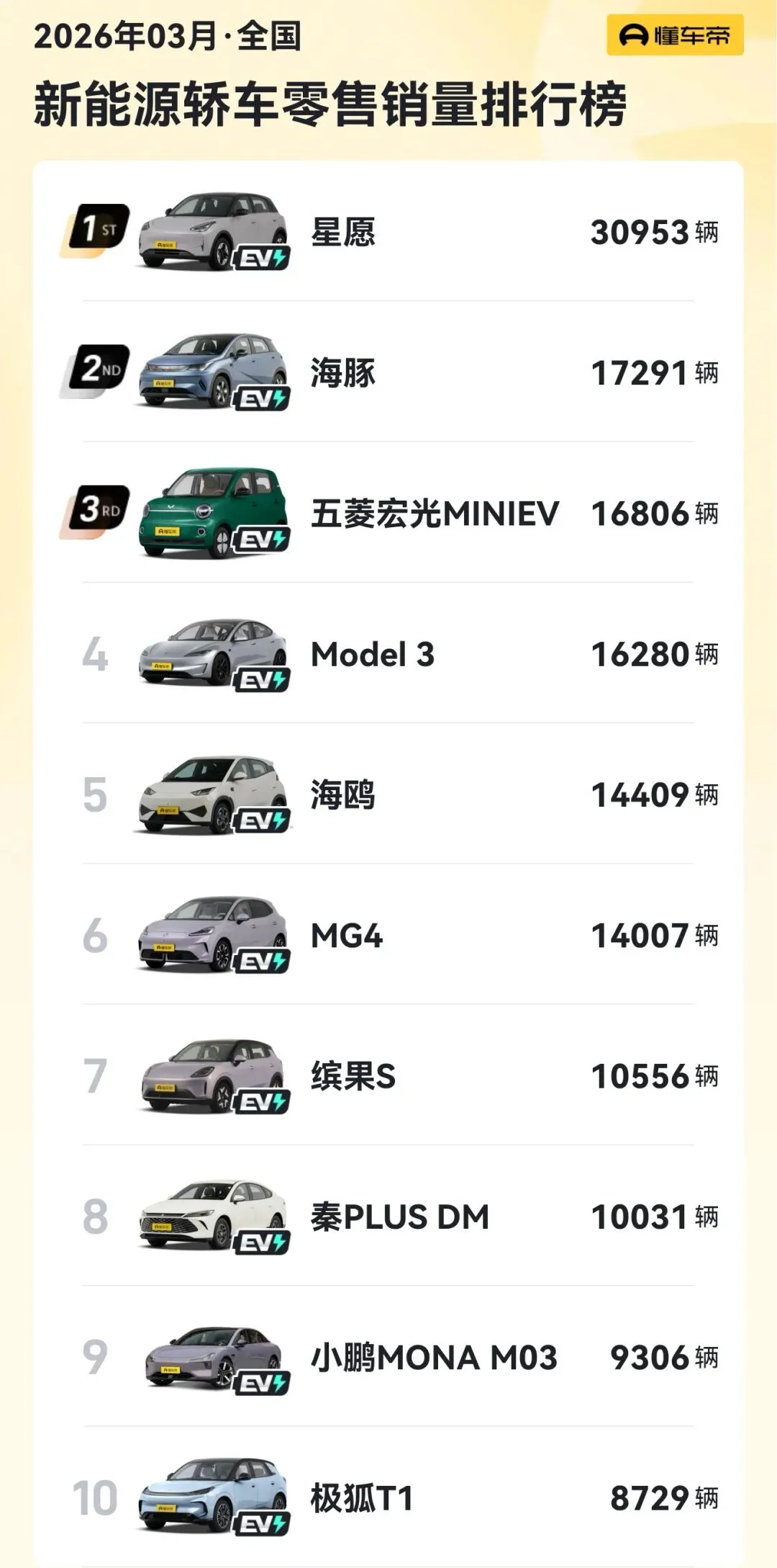 3月的销量榜单透露出几个明确信号: