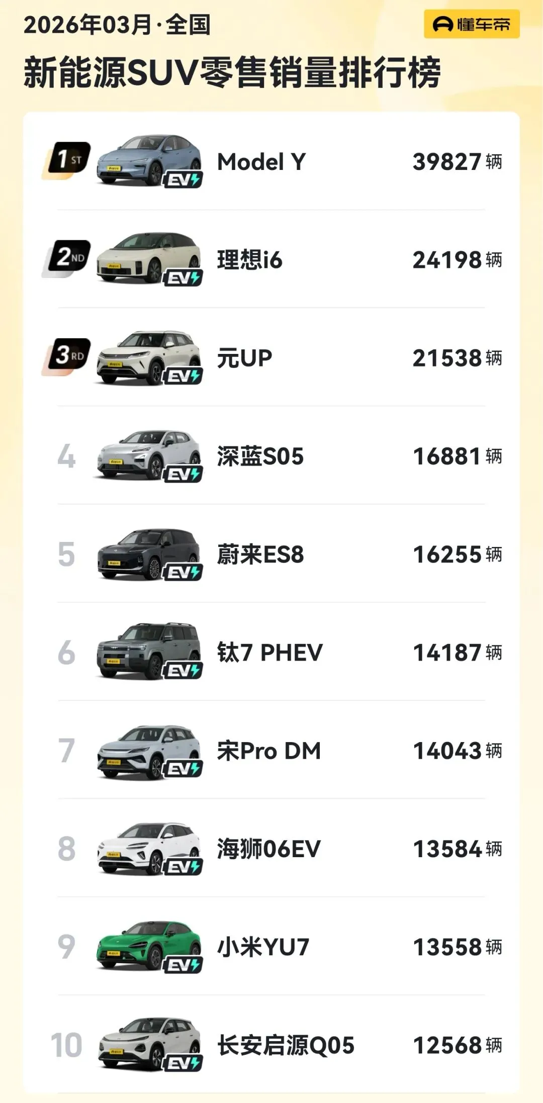 近日,3月新能源轿车与SUV零售销量排行榜出炉。