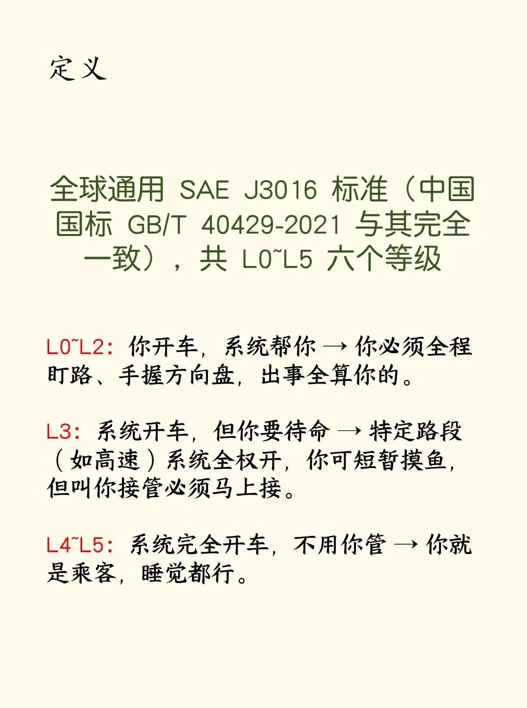 全球通用 SAE J3016 标准(中国国标 GB/T 40429-2021 与其完全一致),共 L0~L5 六个等级