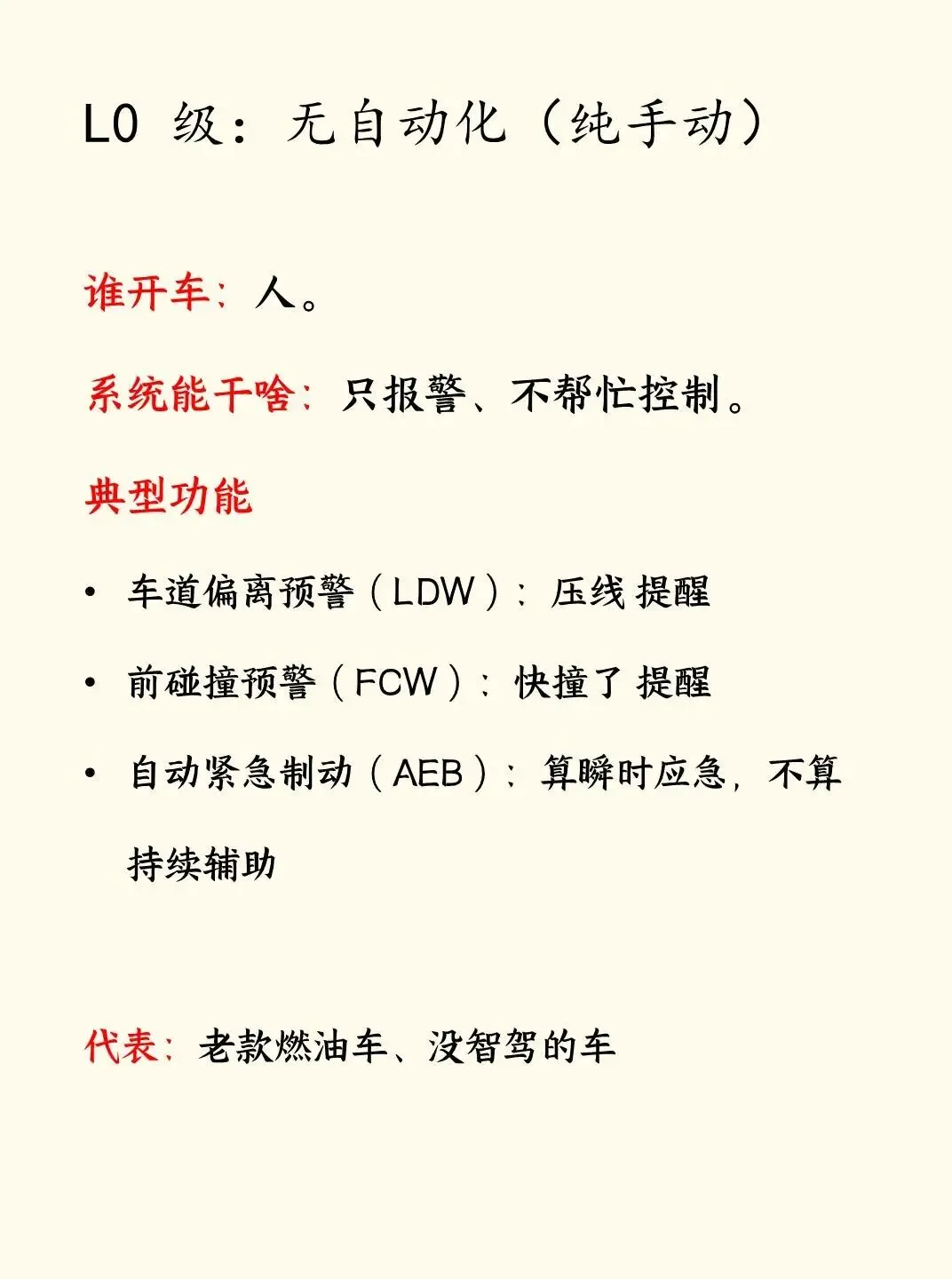 L0~L2:你开车,系统帮你 → 你必须全程盯路、手握方向盘,出事全算你的。