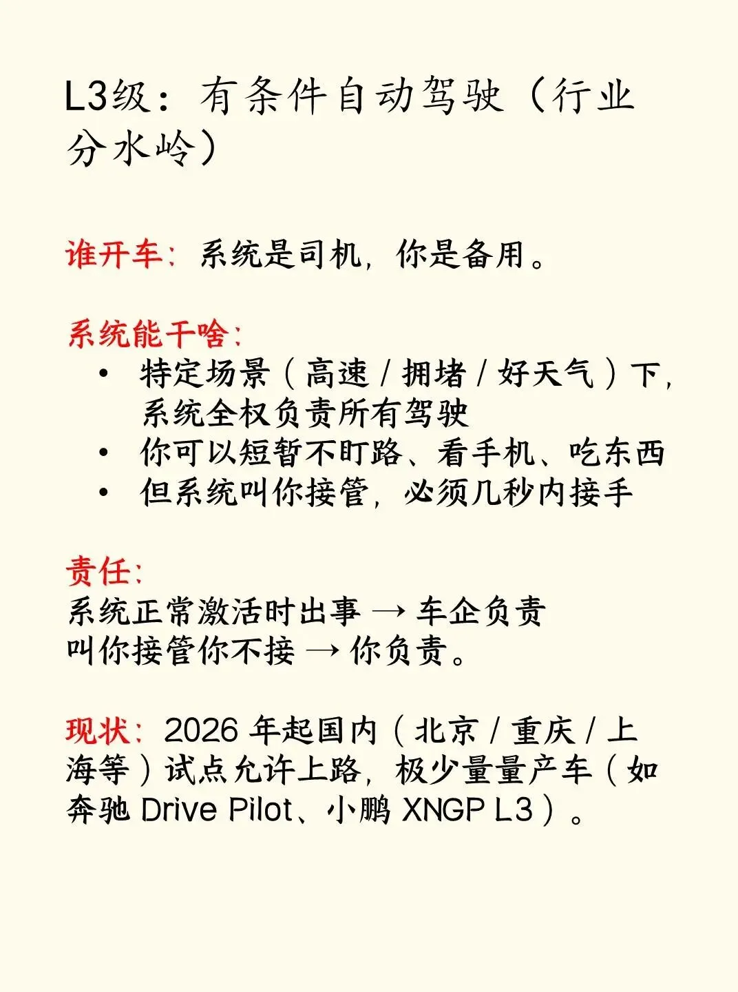 •L3 才是真自动驾驶起点,但现在极少、仅限试点、限定路段。