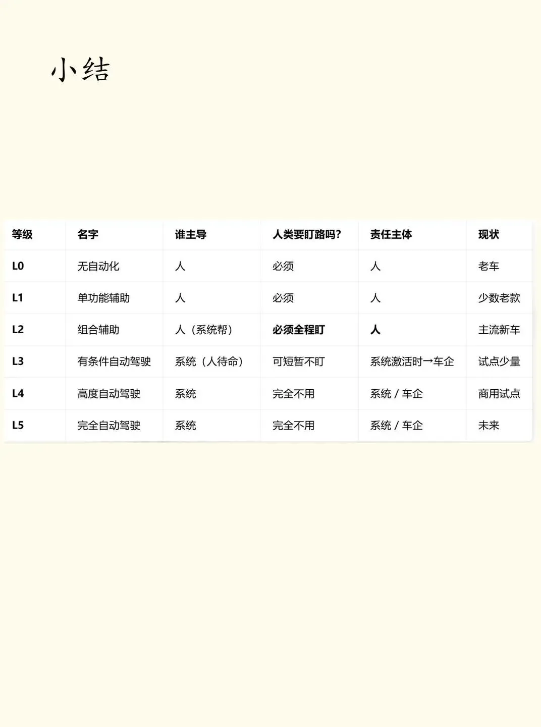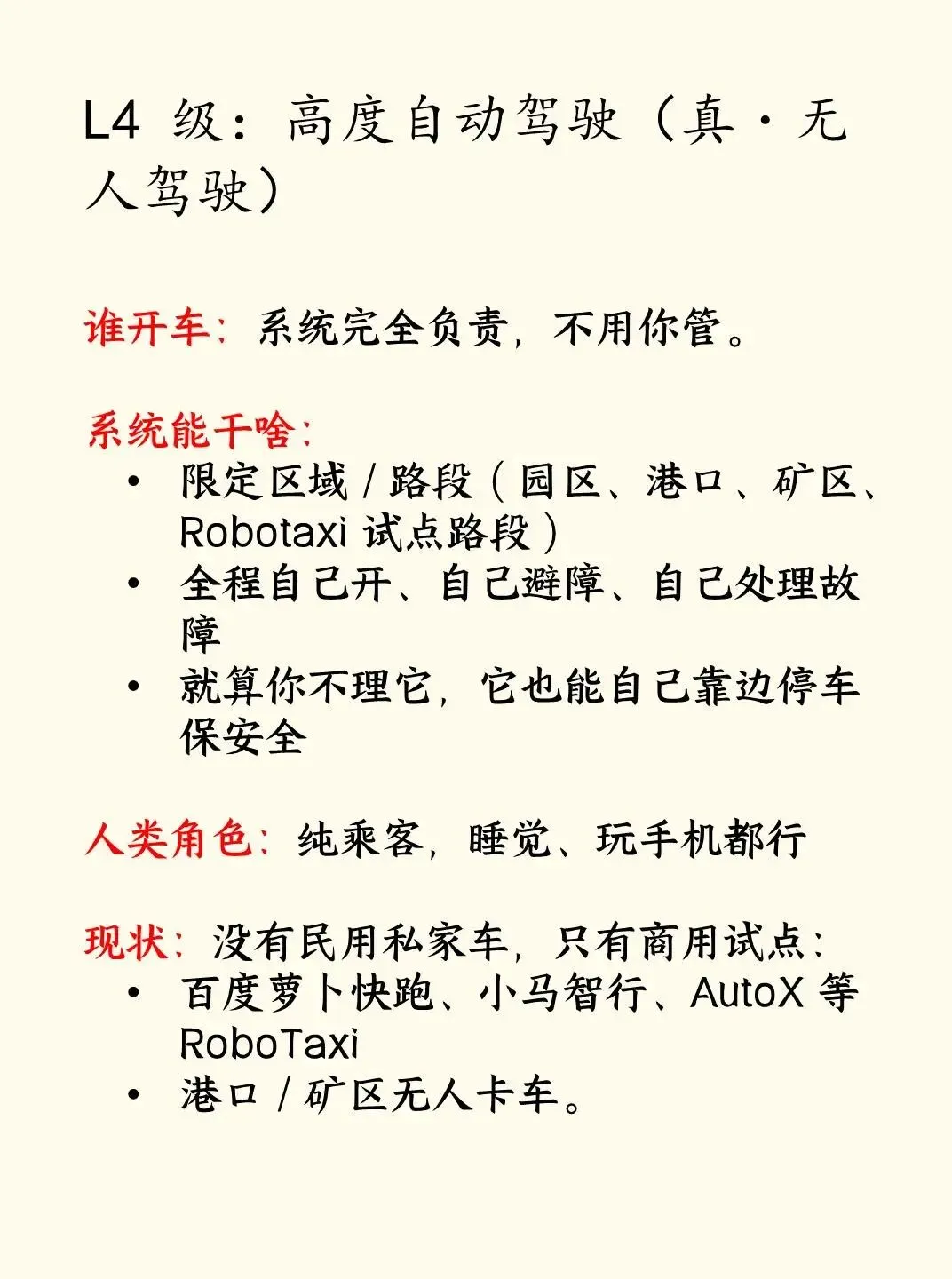L3 极少、试点、限制多、不能真睡觉。 家用 L4 至少还要 3–5 年。