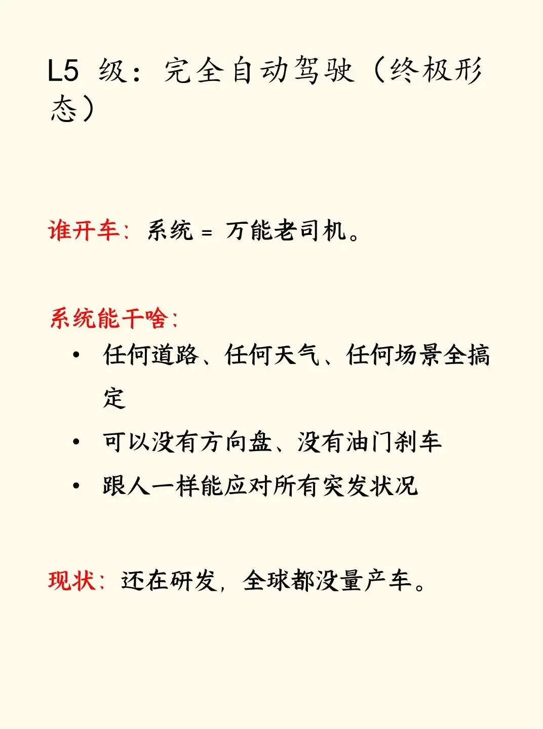 L4~L5:系统完全开车,不用你管 → 你就是乘客,睡觉都行。