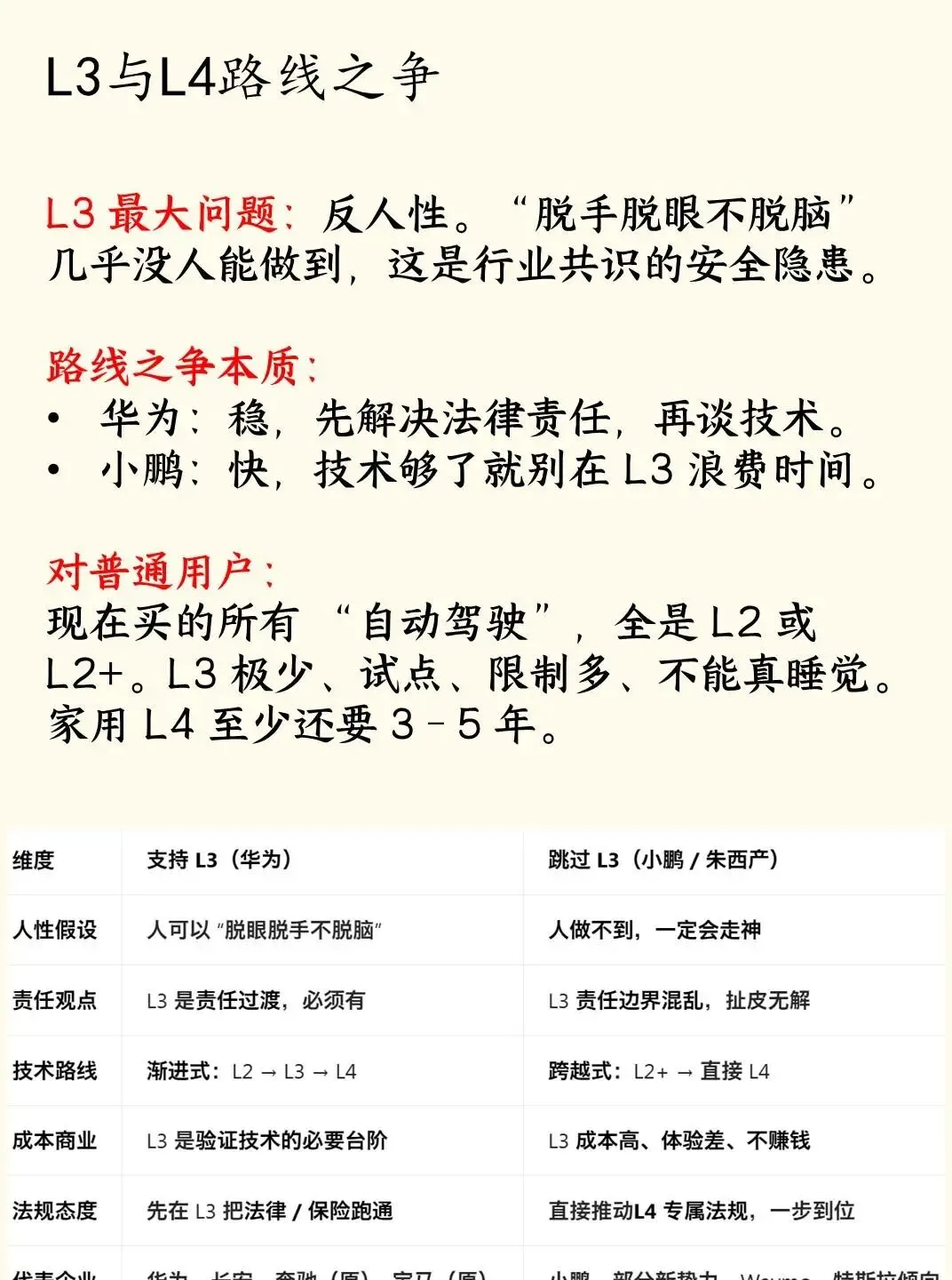 L3 最大问题:反人性。“脱手脱眼不脱脑” 几乎没人能做到,这是行业共识的安全隐患。