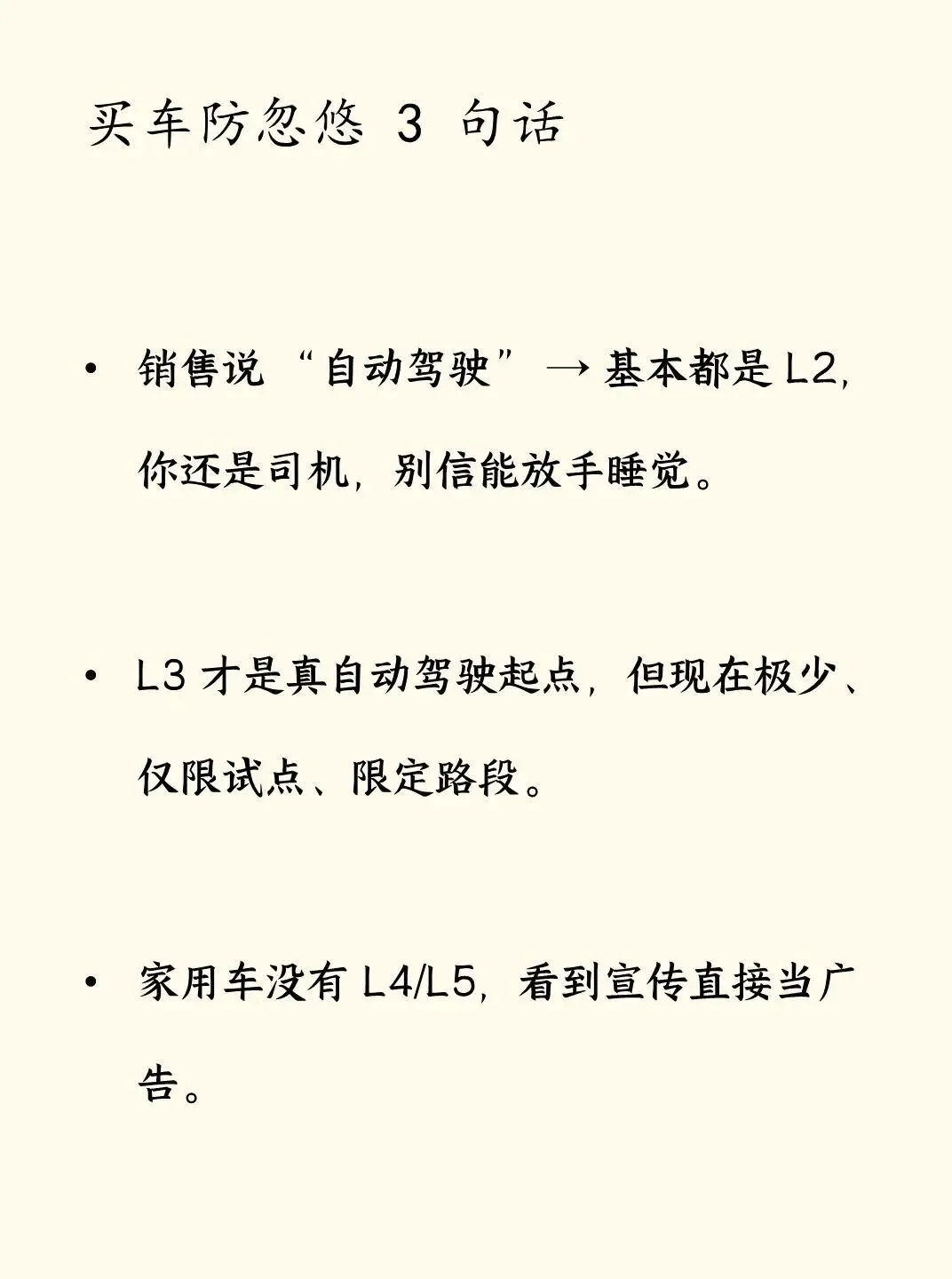 •销售说 “自动驾驶” → 基本都是 L2,你还是司机,别信能放手睡觉。