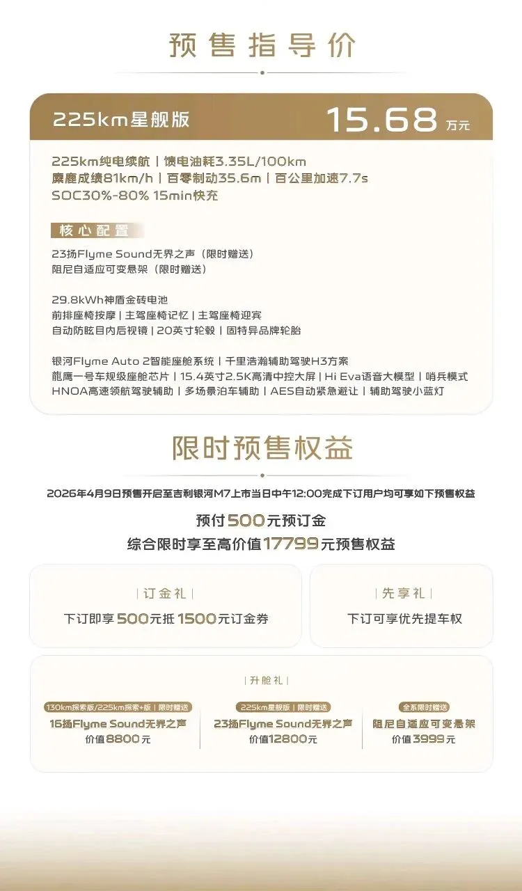 13.98万起的预售价格,配上225km纯电续航、全场景智能、越级舒适这些硬核配置,银河M7无疑是15万级家用电混SUV的“优选之一”。无论是日常通勤、周末家庭游,还是长途出行,它都能兼顾成本、舒适与安全,让家用出行“刚刚好”。