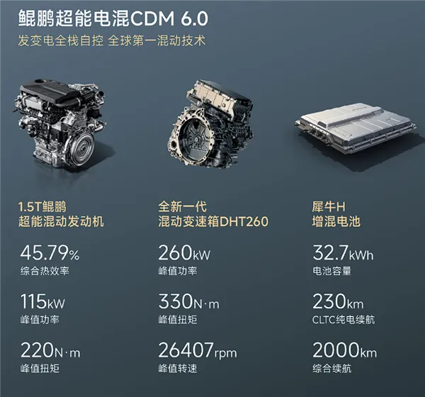 性能上,鲲鹏超能电混CDM 6.0系统开创中型混动SUV"235"时代:综合续航2000km+,馈电油耗仅3.9L,零百加速5秒级,彻底终结"续航与油耗不可兼得"的行业偏科。配合飞鱼底盘与CDC电磁悬挂,过减速带如履平地,让全家人告别晕车困扰。