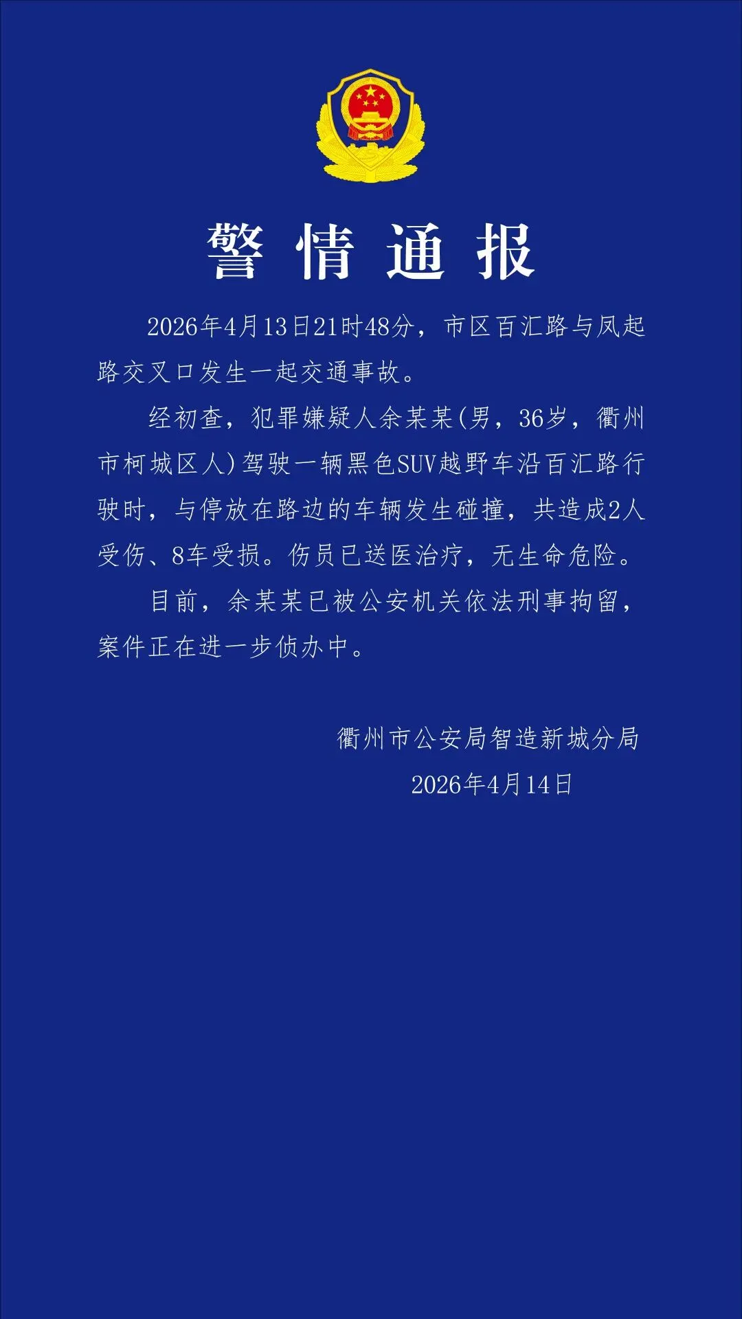 4月14日,衢州市公安局智造新城分局发布警情通报: