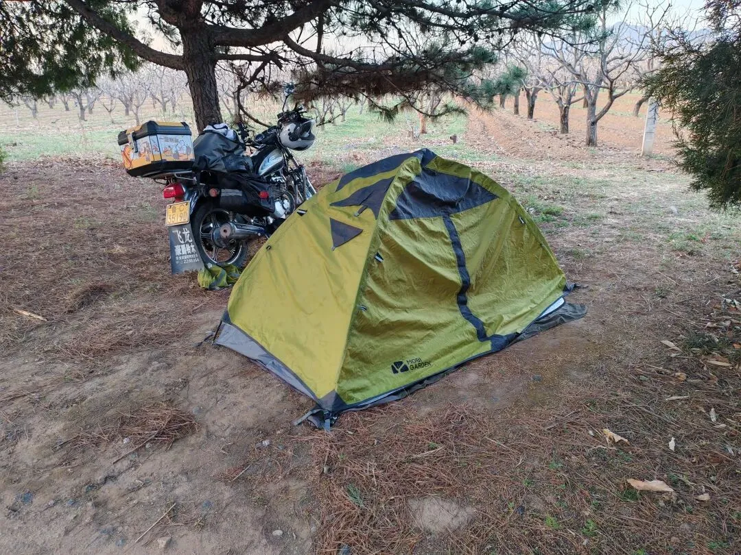 到了摩托车前,继续撑帐篷。撑起帐篷后,一缕夕阳斜射进松林,平添一种诗情画意。我开始坐在帐篷前剪辑视频,耳边偶尔响起一阵嬉笑声。剪完一个视频发表后,太阳已经完全落山了,松林中升起沉沉暮色。风一阵阵吹来,松林摇动着,发出沉重的叹息般的声音。此时,我才觉得这并不是搭帐篷的好地方——太让人压抑了!一向无神论的我,竟然感到了几分恐惧……
