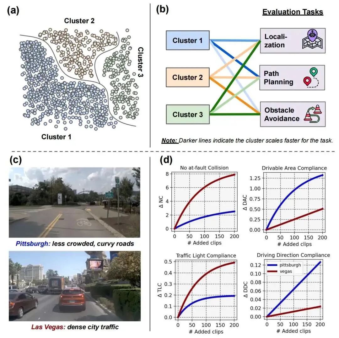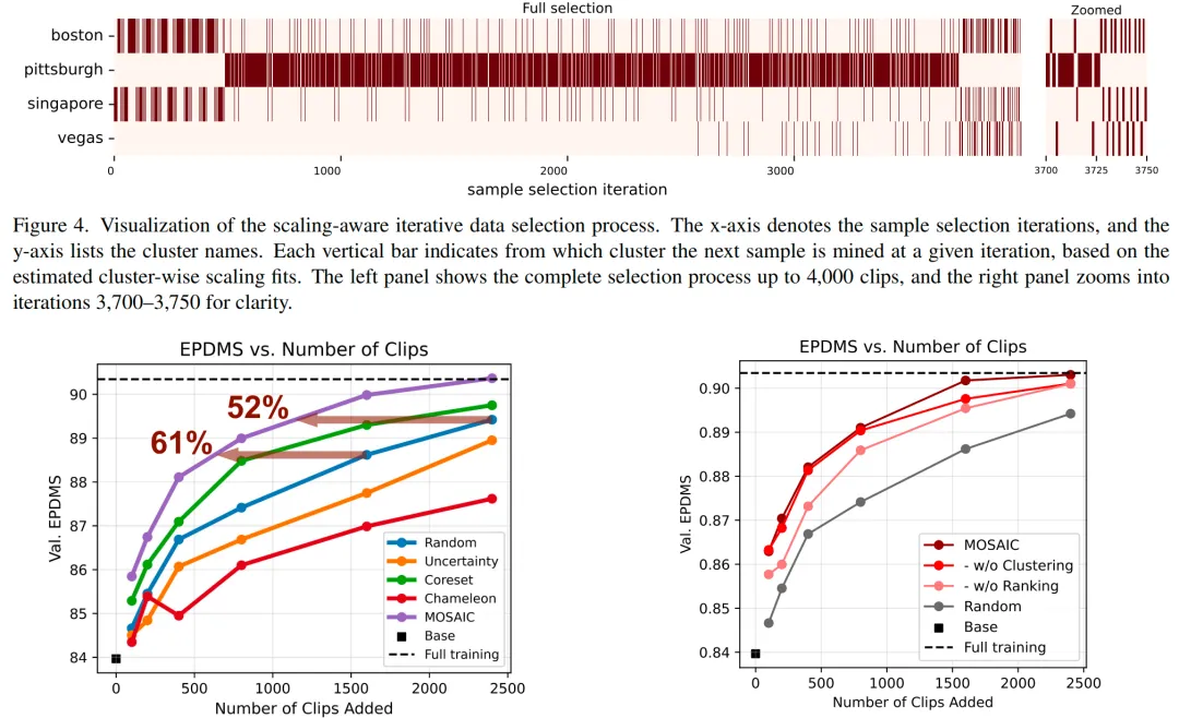 MOSAIC给出的答案如下:随机采样或者按照不确定性挑选数据都不可靠,单纯的追求数据多样性亦非正确的途径。要做一件更像“数据经营”的事 ——先把数据按影响模式分群,再估计不同数据群对各项驾驶指标的收益曲线,最后按边际收益一条一条地往训练集里加。