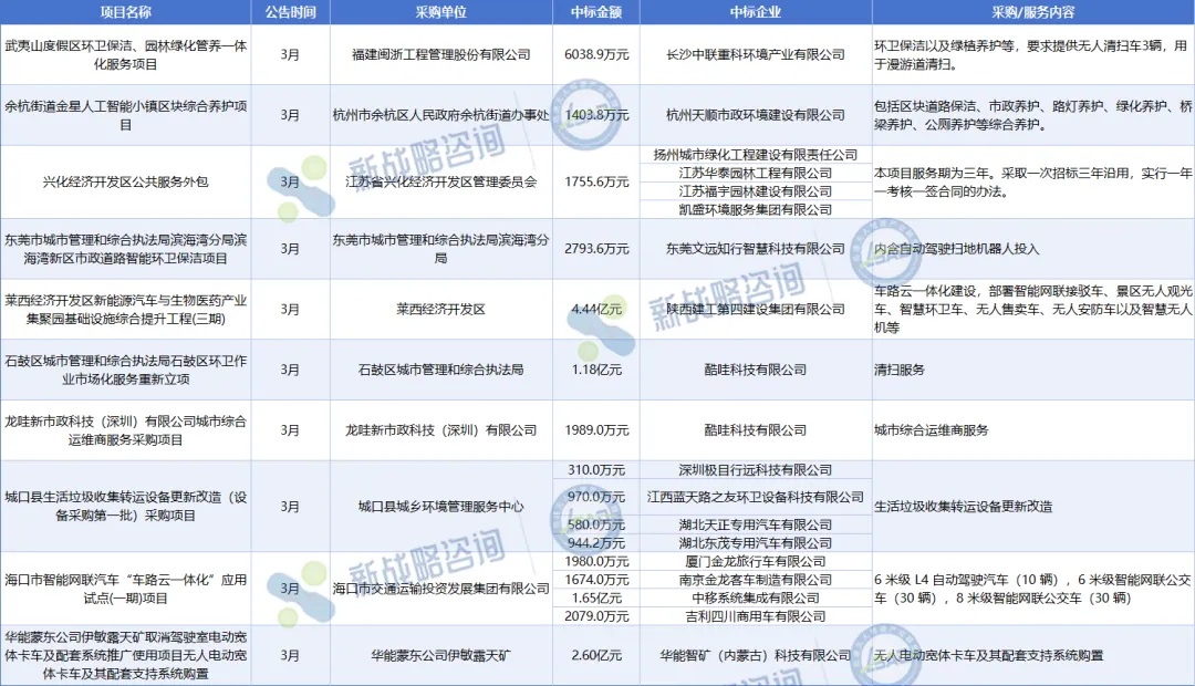 从领域分布来看,当月统计新增38个项目,涵盖无人环卫、无人巡检、无人接驳、教育科研、无人矿区、无人港口等多个领域,其中,无人接驳项目数量相较于2月有所上升,当月披露的6项中标项目累计金额近7亿元。