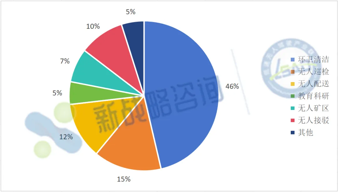 具体看来,当月项目集中分布在“清洁环卫”及“无人巡检”两大领域,项目数总占比接超60%,其次是无人配送和无人接驳,占比达到12%和10%。