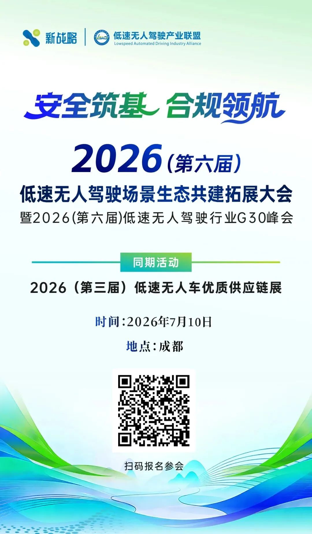 2026年7月10日,低速无人驾驶产业联盟将在成都举办2026(第六届)低速无人驾驶场景生态共建拓展大会暨2026(第六届)低速无人驾驶行业G30峰会,同期将举办2026(第三届)低速无人车优质供应链展会,敬请期待!