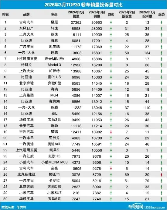 据行业综合销量数据显示,2026年3月国内轿车市场累计零售销量67.6万辆,环比上涨59.8%,同比下降25.1%。同期,车质网受理车主针对轿车的有效投诉11,403宗,环比大涨73.7%,同比下降9.7%。去除投诉人自愿申请撤诉的信息后,2026年3月TOP30轿车销量投诉量排名如下: