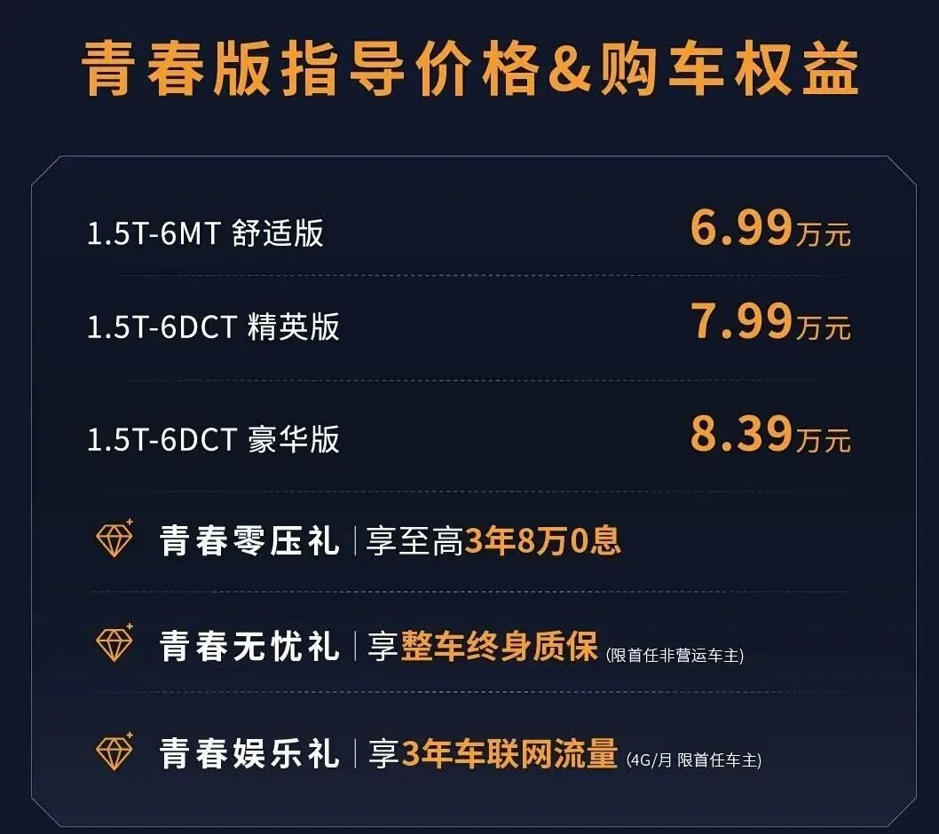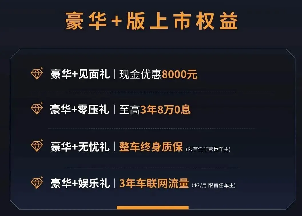 看看这个上市权益组合:现金优惠 8000 元、至高 3 年 8 万 0 息、整车终身质保、3 年车联网流量。
