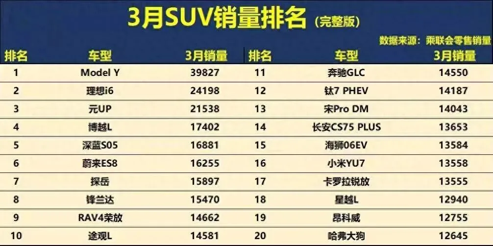 随着各家车企3月销量陆续公布,国内SUV的销量榜单也新鲜出炉。从整体数据看,新能源与传统燃油车的竞争格局进一步固化,同时头部车型的集中效应依然明显。
