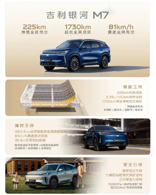 选纯电吧,逢年过节跑长途要在服务区排队等充电,欲哭无泪;选燃油吧,现在油价涨得心疼,日常通勤成本高到像给加油站打工;选插混吧,好多车型纯电续航只有百十公里,开两天就得充,亏电油耗比燃油车还高,活生生搞成了“两头不靠”的尴尬物种。别愁,今天刚开启预售、13.98万起的吉利银河M7,简直是专门来破这个局的。作为之前爆卖到年销百万的新能源优等生银河系列的新成员,它还是首款车型银河L7的“加量不加价”升级版,续航、车机、尺寸、智驾全维度升级,预售价却只贵了一点点,性价比直接拉满。这次银河M7直接给塞了块29.8kWh的同级最大金砖电池,纯电续航干到了225km。就按大多数人一天通勤40公里算,周一出门前充一次电,工作日开5天完全够用,周末周边近郊跑个来回都不用烧油,日常完全可以当纯电车开,一个月油费说不定也就两杯奶茶钱。要是跑长途更不用担心,综合续航直接拉到1730km,从广州开到武汉都不用中途补能,完全没续航焦虑。就算你忘了充电也没关系,馈电油耗才3.35L,比大多数同级燃油车省一半都多,再加上15分钟就能从30%充到80%的快充速度,中途在服务区买个水、上个厕所的功夫电就补得差不多了。。北方的朋友也不用犯愁,这块金砖电池零下40℃的极寒环境也能正常工作,冬天续航打折的老毛病也给解决了,以前插混“两头不讨好”的短板,这次直接给拆得干干净净。还有好多人容易忽略的驾控安全,这次银河M7也给足了惊喜。你敢信一台A级SUV的麋鹿测试成绩能跑到81km/h?这已经是不少运动轿车的水平了,平时路上遇到突发情况窜出来个电动车、小动物,急打方向也稳得很,完全不用担心侧翻的风险。。背后靠的就是GEA Evo架构加AI虚拟底盘调校的加持,平时过减速带、走坑洼烂路,滤震效果特别好,老人小孩坐后排也不会晃得晕车。而且这套“电池+续航+安全”的组合拳,不是随便拿供应商的方案拼出来的,全都是吉利全栈自研的成果,现在中国混动早就过了拼单项参数的阶段了。比的就是系统整合的效率,这也是银河系列能做到年销百万的核心底气,不是纸面数据好看,实际开起来的体验才是真的香。其实说白了,15万级的家用插混SUV,用户要的从来不是什么花里胡哨的黑科技,就是省心、省钱、安全,刚好这几点银河M7全给踩中了,说是A级插混的第一梯队选手真的不夸张。最后也问问大家,要是你最近正打算入手这个价位的家用SUV。。这台加量不加价、家用属性点满的银河M7,会是你的菜吗?素材来源:网络