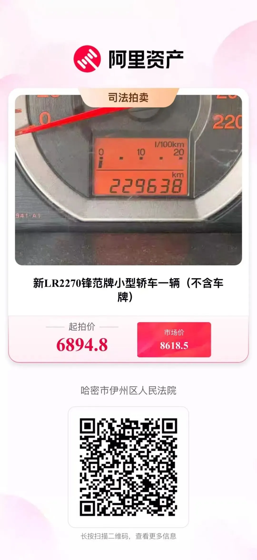 哈密市伊州区人民法院定于2026年4月15日16时至2026年4月16日16时止(延时除外)在伊州区人民法院阿里巴巴司法拍卖网络平台上将新LR2270锋范牌小型轿车一辆(不含车牌)进行公开拍卖活动。