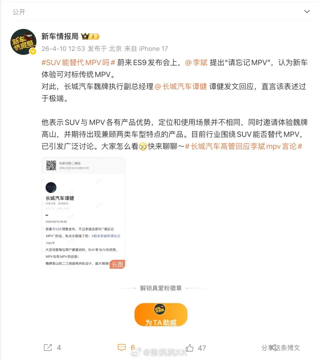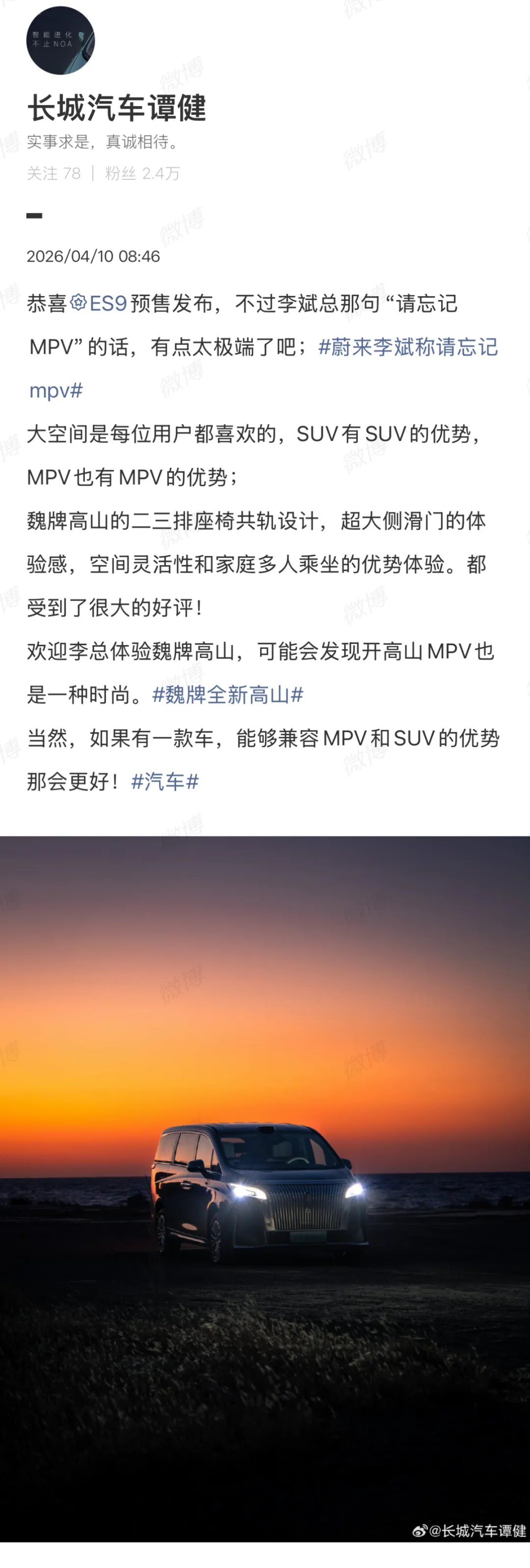 SUV能替代MPV吗?很有意思的话题,我最近也在思考。这是长城汽车谭健 关于李斌 的“请忘记MPV”言论的回应。