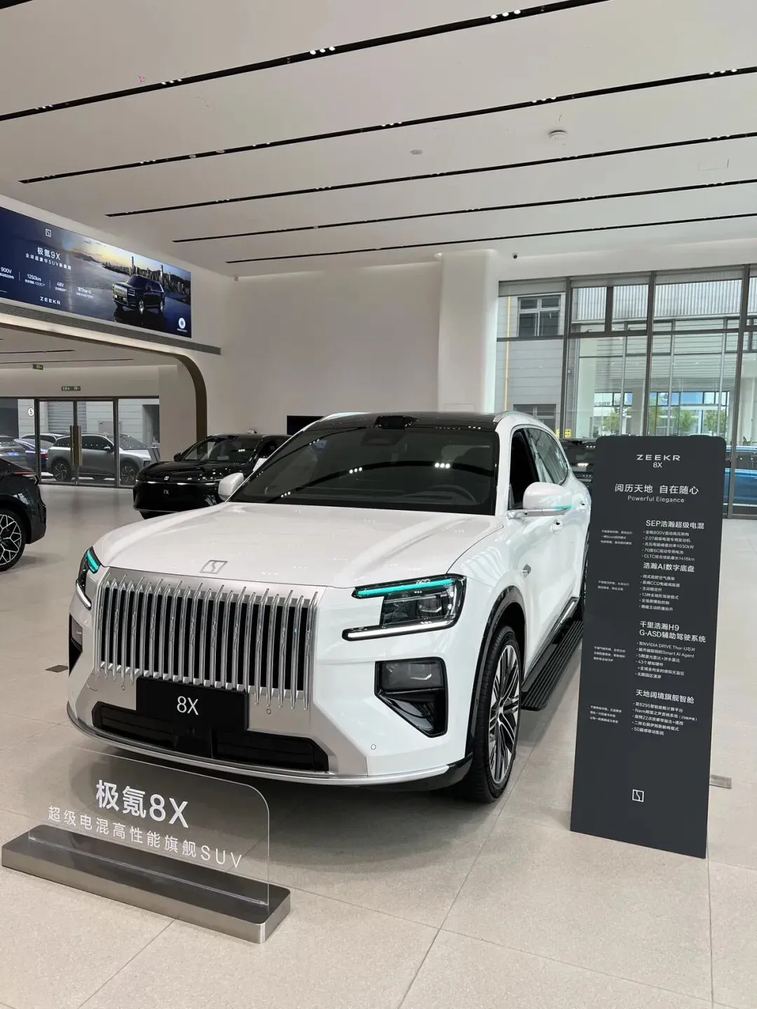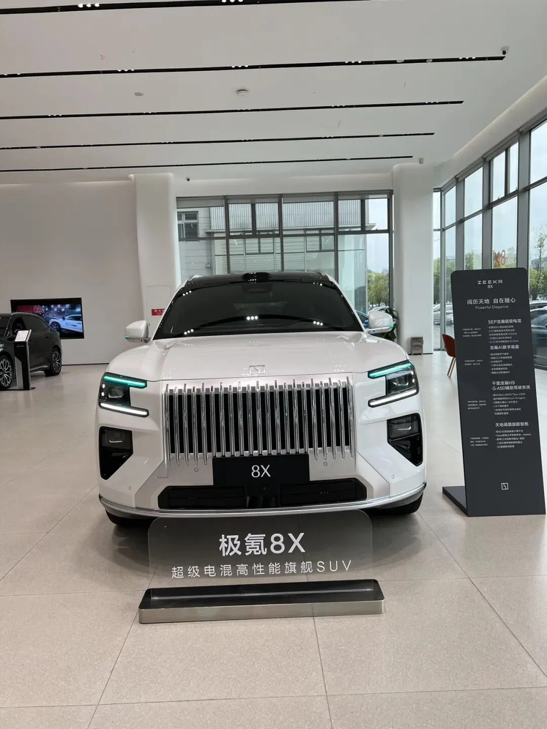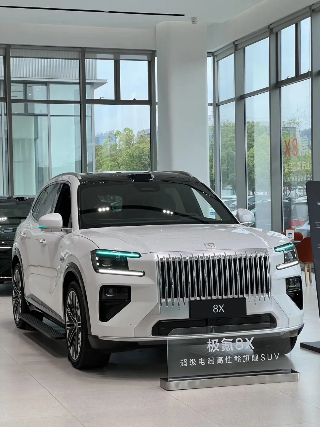 极氪8X前脸与9X高度相似,但是8X尺寸更紧凑,姿态更低趴运动,线条更流畅凌厉,整体审美在线,风格既豪华又运动。