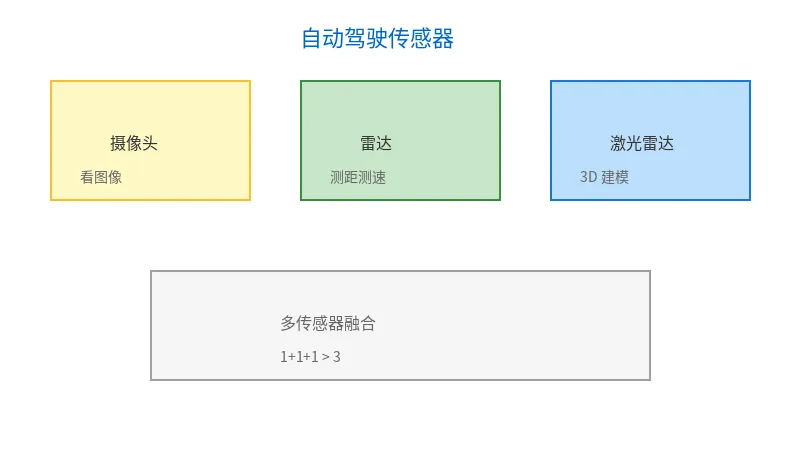 摄像头、雷达、激光雷达,各展所长,互补不足。