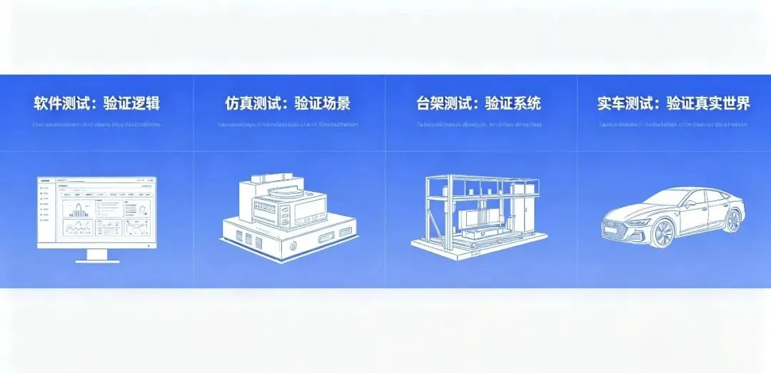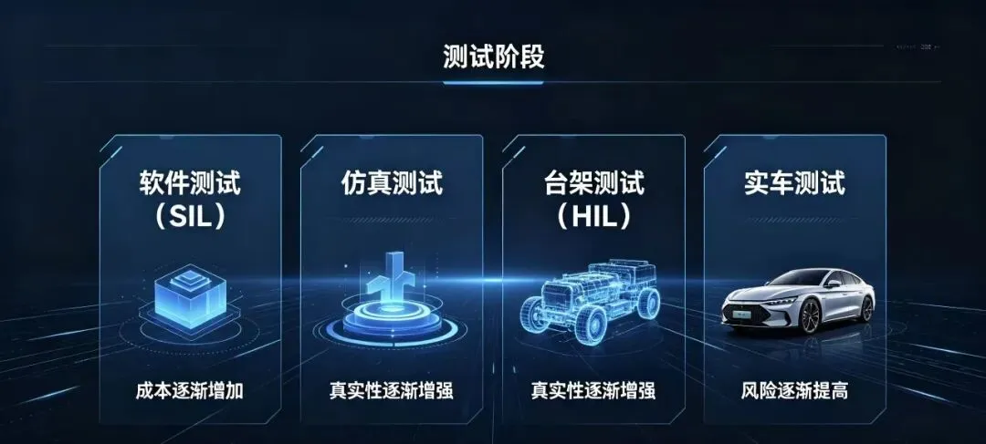 软件测试(SIL) → 仿真测试 → 台架测试(HIL) → 实车测试