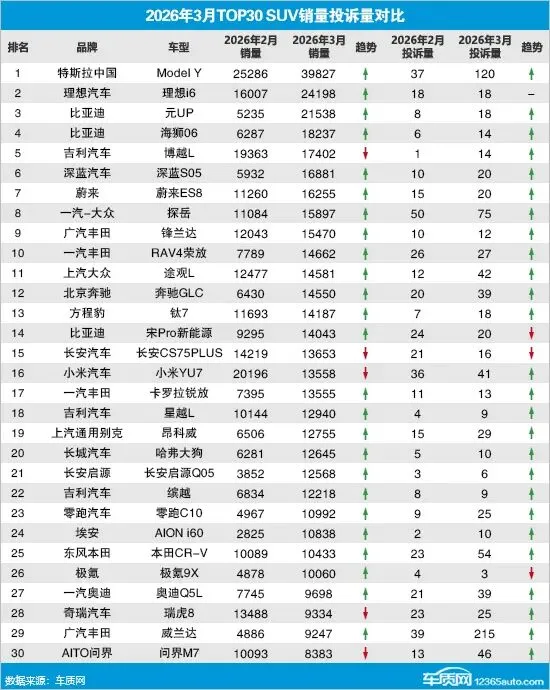 据行业综合销量数据显示,2026年3月国内SUV市场累计零售销量89.3万辆,环比上涨60.9%,同比下降5.9%。同期,车质网受理车主针对SUV的有效投诉6,918宗,环比上涨53.1%,同比下降27.5%。去除投诉人自愿申请撤诉的信息后,2026年3月TOP30 SUV销量投诉量排名如下: