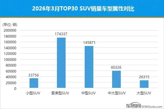 3月,除中大型SUV外,其余各车型销量环比都有不同幅度的增长, 其中小型SUV表现最为突出,环比涨幅接近1.8倍,达到近半年峰值。相比之下,中大型SUV销量逆势下滑,较2月份下降11.7%。