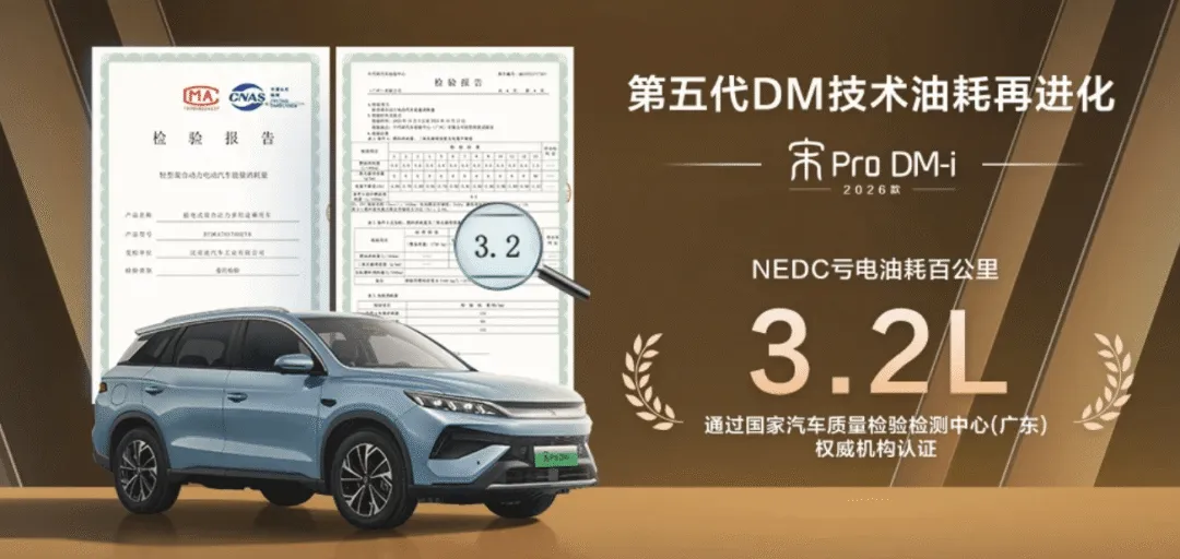 它是典型的插混(PHEV)车型。2026款升级了第五代DM技术,亏电油耗低至4.2L/100km,满油满电综合续航超过1300公里。什么意思?你从北京开到上海,中途不用加油也不用充电。