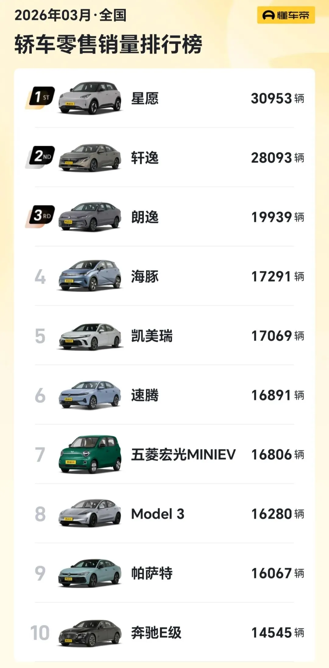 吉利星愿打破了合资燃油车长期垄断轿车榜榜首的局面,自主纯电家轿正式进入领先地位。