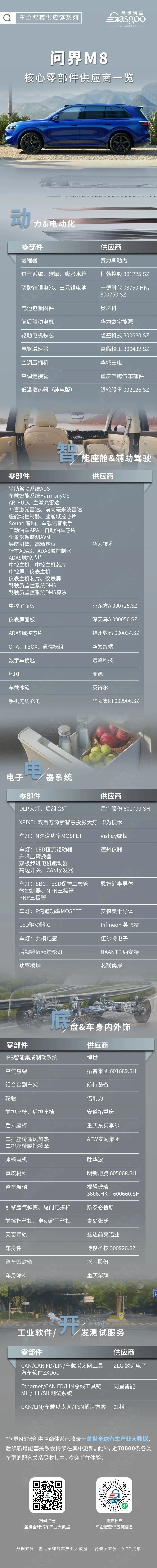 为进一步拆解这款旗舰SUV的核心竞争力,盖世汽车收集整理了问界M8的核心零部件供应商信息,欢迎更多行业朋友进行信息补充和更正。
