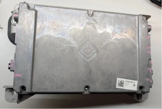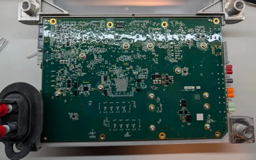 接下来进入内部拆解!如前文所述,AXM共包含4块PCB:2块主板+2块子板。两块主板分别位于中央水冷板两侧,一侧为XMM,一侧为ACM。拆下带 Rivian Logo 的一侧盖板,首先看到的是:XMM PCB!揭开外壳后首次看到XMM主板。