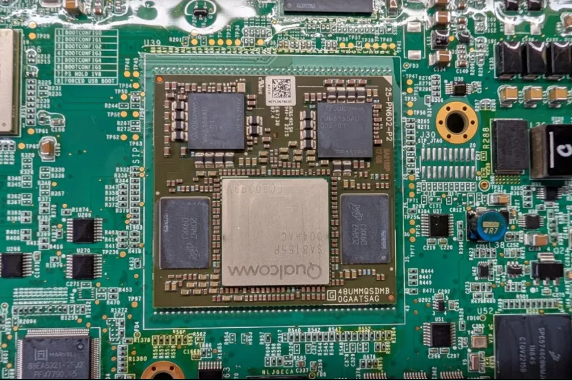 所有核心器件都在背面。主应用处理器为高通 SA8155P,搭配 12GB DDR4 内存,规格相当不错。深入观察后,我非常喜欢这块 PCB 的一点:丝印标注与测试点极其丰富!凭借这些清晰的标识和测试点,未来诊断与维修会非常方便,这是我在以往拆解的车机板上很少见到的。顺带一提:有人可能会问,这么详细的丝印会不会降低安全性,方便逆向与攻击?