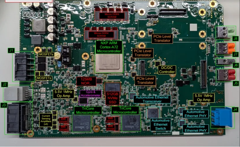 板载主处理器为 NXP Layerscape 8 核 ARM Cortex-A72,搭配 10GB 内存;板底边缘有两颗 英飞凌 TriCore TC299 单片机;右侧区域为两块图像处理子板。