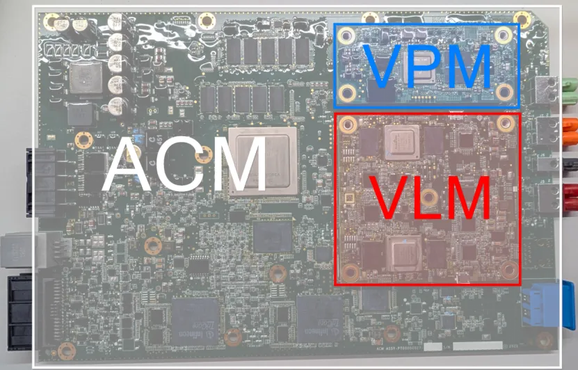 VPM 是 ACM 上尺寸更小的长方形子板,同样用于视频处理,主要负责车辆轮眉摄像头的图像数据。板载丝印:VPM_PT00015446 C