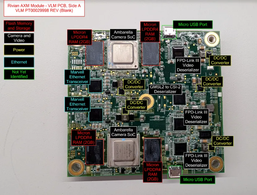 板子近乎对称设计,搭载两颗安霸摄像头处理 SoC,每颗配 4GB LPDDR4 内存。有趣的是板上还有双 Micro USB 口,可能是遗留的调试接口。