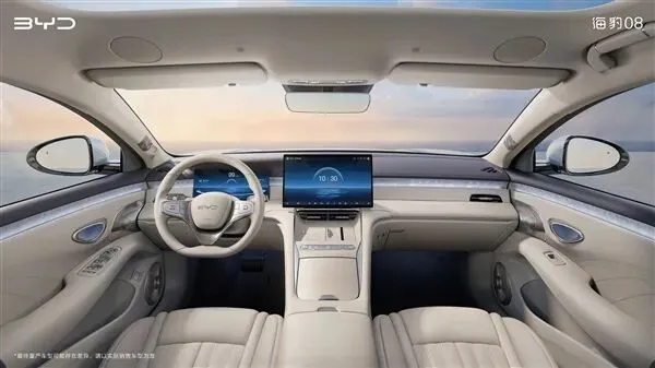 此次发布的海豹08内饰为浅色系,大面积使用了皮质包裹,同时也几乎看不到任何备受吐槽的钢琴烤漆,整体显得很是和谐统一,视觉效果很是柔和。
