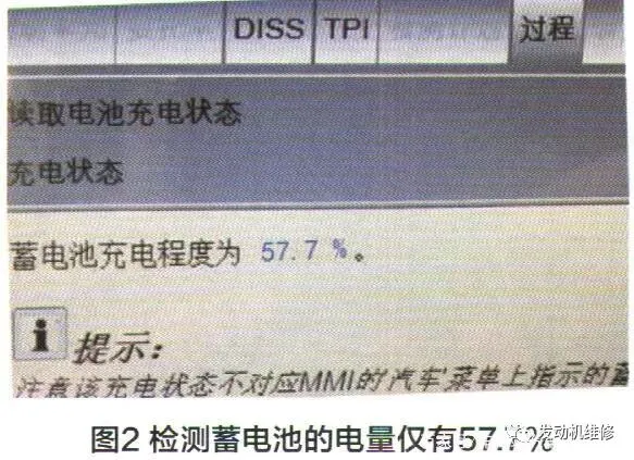 用VS6150D诊断仪检测蓄电池电量,发现蓄电池电量仅有57.7%(图2)。考虑到奥迪轿车新车交付时,蓄电池电量必须超过80%,即便装新的蓄电池,也要充满电后装车匹配才能有“启停”功能。显然此车蓄电池当前电量不足才造成了没有启停功能。于是再对蓄电池充电一个晚上,再测试蓄电池电量却只增加到59%,只充了2%的电量!当时充电电流只有2A,明显偏低,怎么会产生蓄电池充电异常呢?
