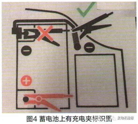 原来此蓄电池的充电必须经过监控器,才能正确检测蓄电池的状况。蓄电池监控器一端接在电池负极端的小盒中,另一端与车身搭铁(图3)。在此蓄电池上有个小标识图,上面有个红色“x”,表明充电不能直接夹负极,而应夹搭铁端,如正确的绿色“√”号所示(图4)。所以正确的补充电的方式,应是将充电器的正负输出端,一端接蓄电池的正极,另一端应搭铁,这样蓄电池监控器才能正确检测到充放电及电池的电量。改正这种补充电的方式后,该车的自动启停功能得以恢复。
