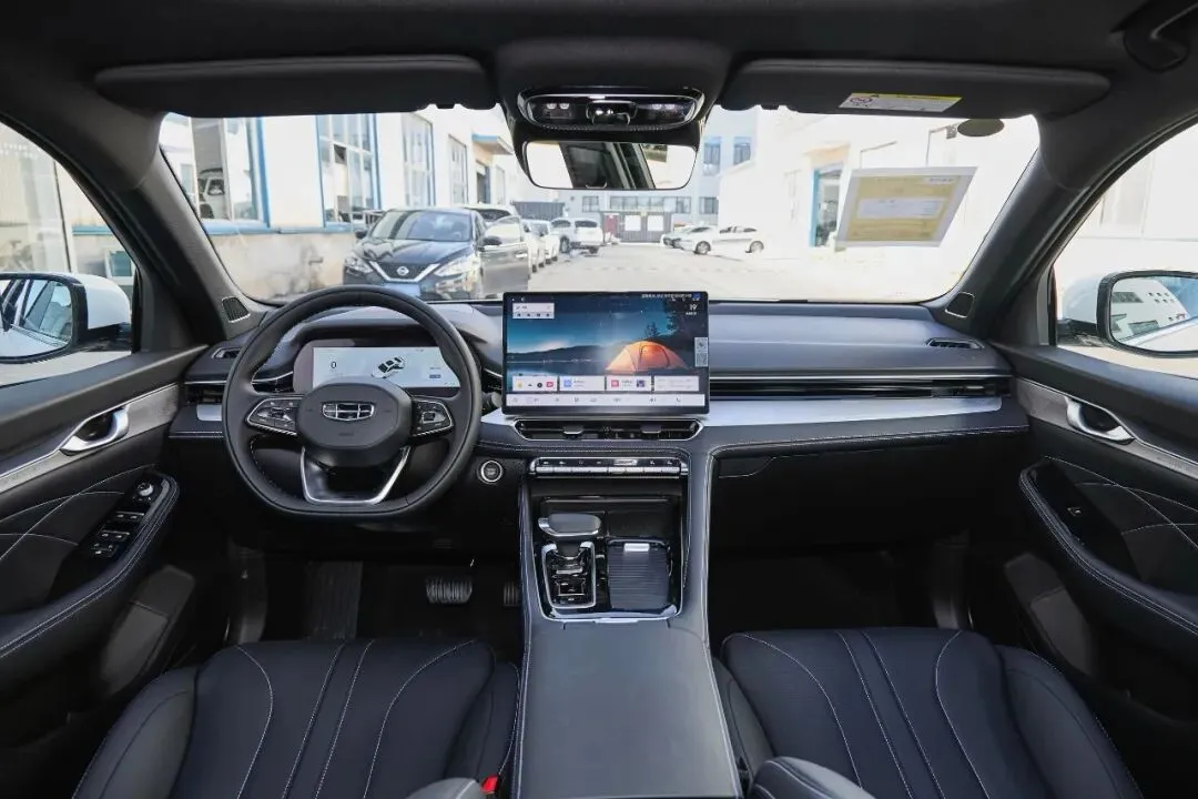 内饰方面用软性皮革包裹,边缘位置还用缝线处理,显得车内做工精细很精细,同时也为车内营造出了豪华感。吉利星瑞虽然也是采用10.2英寸的全液晶仪表,但是在仪表上方配有遮阳板,相比悬浮式液晶仪表来说提升了遮光性,在强光状态下也能看清仪表上的内容。中控部分搭载一块14.6英寸屏幕,具有导航和手机互联功能,但是在屏幕下方保留了实体按键,开车时盲操作更方便。